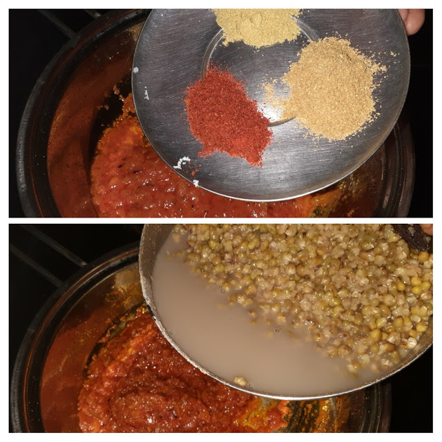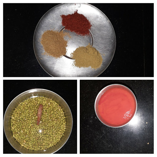 - Tomatoes can be chopped and added too instead of pureeing, but in this recipe particularly I prefer to add the pure, as the Green moong is a little bland and the pureed tomatoes impart a little sourness to the dish than chopped and cooked ones.