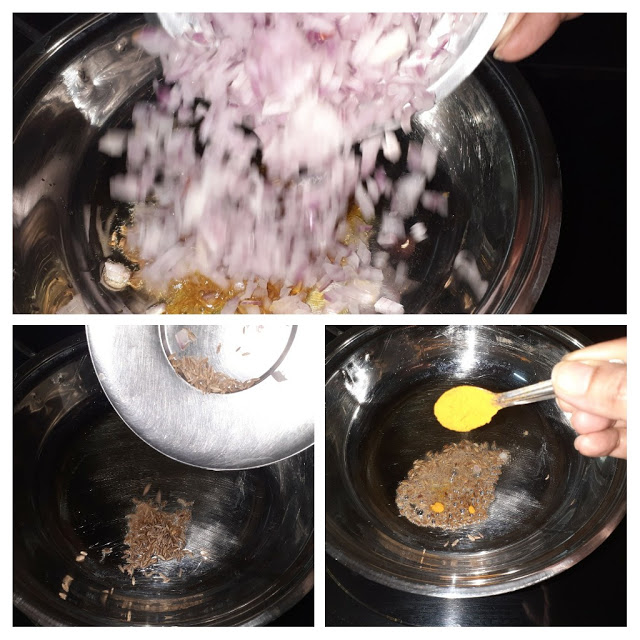- Take oil in a karahi and heat. Add the cumin seeds and allow to splutter. Add the turmeric powder and the chopped onion.