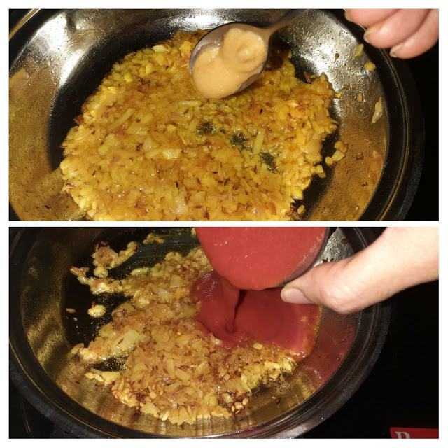 - Fry nicely, until the onion starts turning slightly brown. Now add in the ginger-garlic paste. Fry for a minute and add the tomato puree. Cook for a minute.