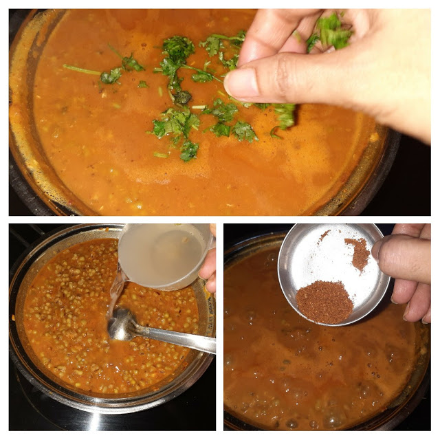 - Add one cup of water( add more if required to adjust consistency. Stir well and allow to simmer for 5 minutes. Add in the garam masala now and switch off the stove. Garnish with coriander leaves and the Green Moong dal is ready to serve.