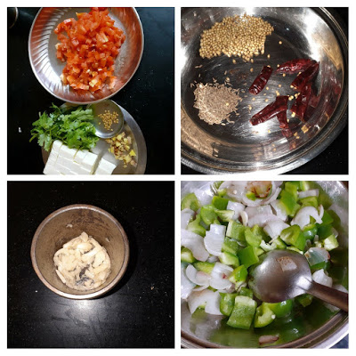 Heat a wok/karahi. Put the coriander seeds, cumin seeds, dry red chillies into it and fry until light brown(without oil). Transfer to a blender, let it cool and then grind it coarse. Now add 1 tsp oil to the wok/karahi and heat. Add the onions and saute on high heat until light brown. Add in the capsicum and continue to saute on high heat until the capsicum also gets a light brown colour. Transfer the sauteed onion and capsicum to another vessel and set aside. In the same wok add more oil and add the crushed garlic and saute, keep stirring at it can stick to the pan bottom. Now reduce heat and add in the prepared masala powder and fry nicely. If the mixture becomes dry, add another teaspoon of oil and fry the masala until the rawness is gone. Add in the tomatoes and saute for a minute. Add half cup of water and cook the tomatoes well. Keep mashing the tomatoes in between so that we get a pulpy mixture. Now add the methi dana and ginger julienne and cook for 30 seconds, add Kashmiri red chilli powder 1/2 and cook for 30 seconds. Now add the capsicum and onions to the tomato paste and continue cooking. When the mixture becomes semi-dry add in the Paneer cubes and stir for 2 minutes, add some crushed Kasoori methi and put off the flame. The Kadai Paneer is ready to serve. Enjoy. Bon Appetit.