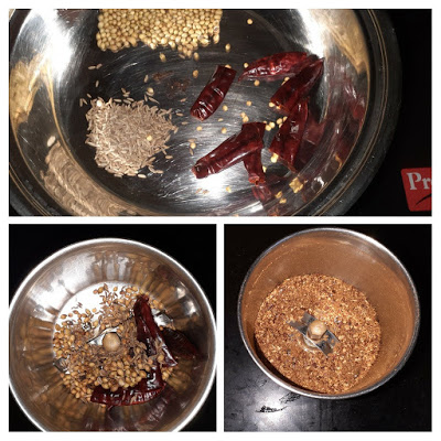 - Roast the Coriander seeds, Cumin seeds and the dry red chillies on a low flame until crisp and light brown in a karahi and cool. Grind to a coarse powder.