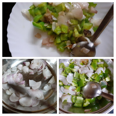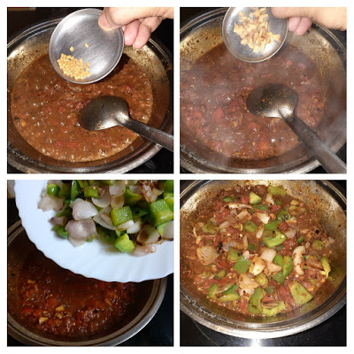 - Now put the Methi seeds and ginger julienne and cook for 30 seconds. Now add the sauteed onion and capsicum, mix well and cook until the mixture becomes semi-dry.