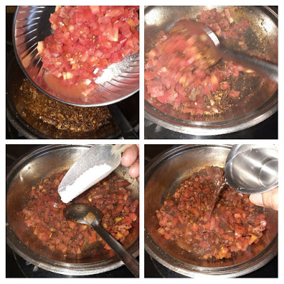 - Now add in the tomatoes and saute. Add salt and half cup of water and cook the tomatoes well. Keep mashing the tomatoes while cooking so that we get a pulpy mixture.