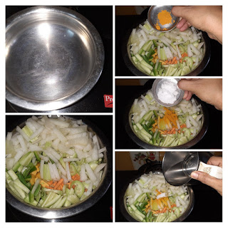- Take a flat bottomed vessel and transfer all veggies, add salt, turmeric powder and water.