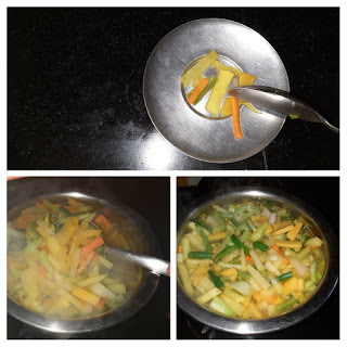 - Let the veggies boil, takes about 10 minutes, keep stirring from bottom to top so that they cook equally. After 10 mins check for doneness. They should be cooked, yet be stiff and not become limp. Put off the stove, drain excess water and keep aside( do not discard the water)