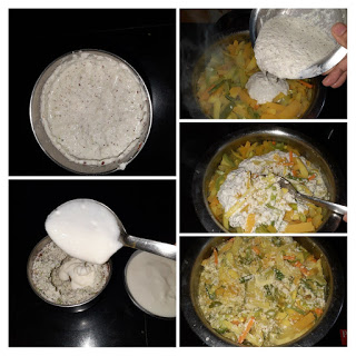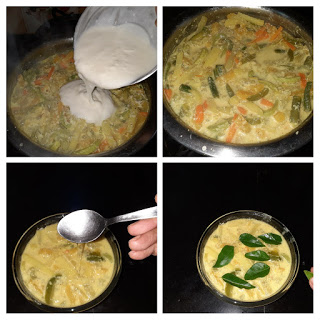 - While the veggies are cooking make your coconut, green chilli and curd paste. Grind it fine, add a little of the saved broth if required to make a smooth paste. Add this paste to the cooked vegetable and allow to cook for 2 mins. Keep stirring while it cools.