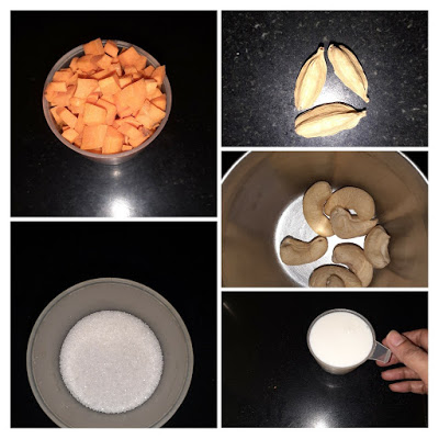 - Assemble all ingredients. Chop Carrots, cut the Cashewnuts to pieces, make a powder of the Cardamom pods.