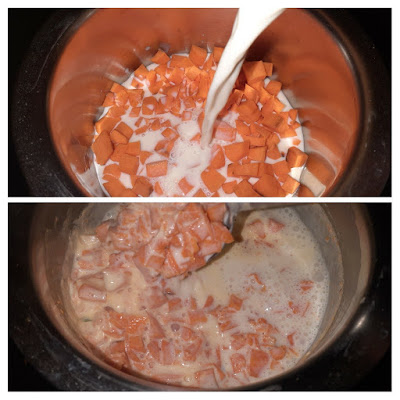 - Put the chopped carrots in a thick bottomed vessel, pour 11/2 cups milk and cook.