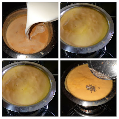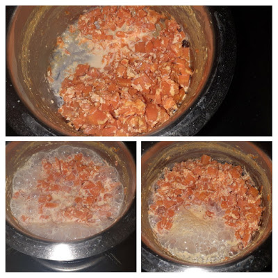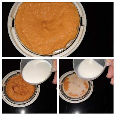 - Pour the puree into the same heavy bottomed vessel and switch on the flame. Add 1 cup of milk and bring to a boil on a low flame. Ad the puree froths and rises up in the vessel put in the sugar and stir nicely to dissolve.