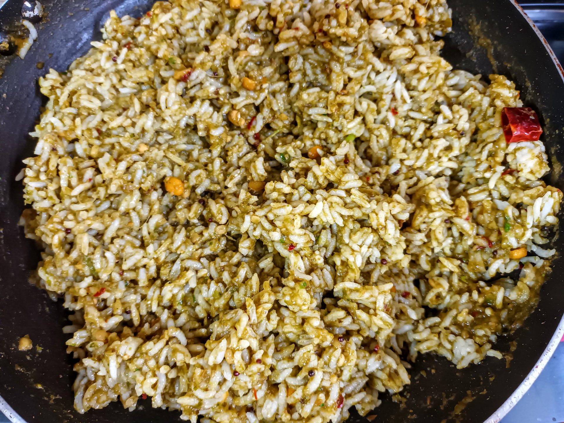 - Add the cooked and cooled rice little by little to the paste. Mix well and switch off the flame. The flavourful Coriander rice is ready to serve.