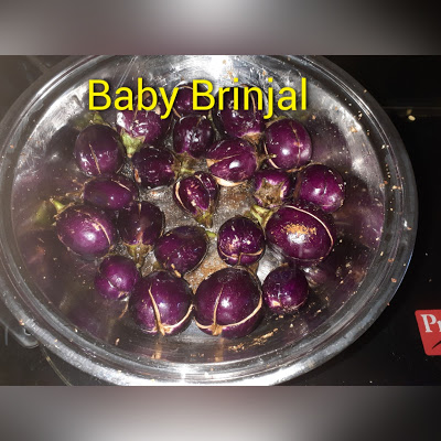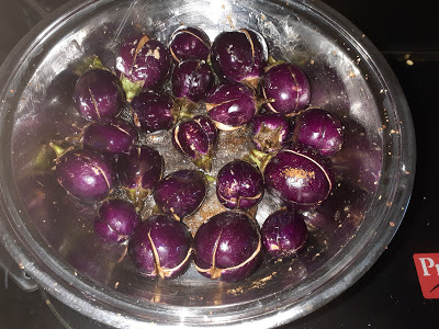 - Slit the Baby Brinjals midway as shown in the picture. Mix 1 tsp turmeric powder, 2 tsp red chilli powder and salt as per taste. Apply this powder into each brinjal. Set aside.