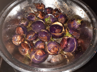 - Do not cut the green stalk of the brinjal. It helps in retaining the shape after cooking. Some people love chewing on the cooked stalk. It tastes really good.
