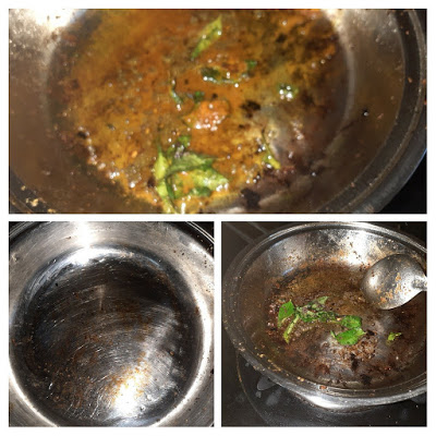 - In the same karahi add another tablespoon oil and heat. Put in the mustard seeds and curry leaves. as the mustard splutters add the turmeric powder and fry for 1/2 a minute.