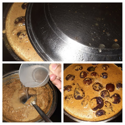 - Now add 2 cups of water and mix. Drop the brinjals slowly into the sauce and cover and cook for 15 minutes, stirring in between every now and then. If using jaggery, add now.