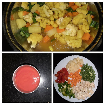 - Assemble all ingredients. Chop and boil all vegetables and puree 2 tomatoes.