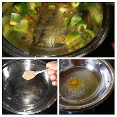 - In a pan take 1 tbsp oil and heat it. Add the cumin seeds and once they splutter, add the turmeric powder and capsicum and saute on high flame for few minutes.