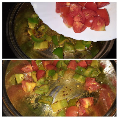 - Lower the flame and add in the chopped tomatoes and saute on low to medium flame for a minute. The tomatoes should not break and become limp.