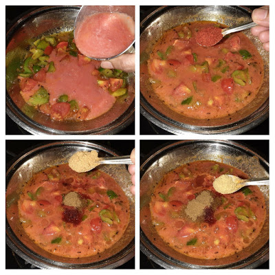 - Now add the tomato puree followed by salt and all the dry spice powders except the garam masala powder, stir nicely and cook for 3 minutes or until the raw smell goes away.
