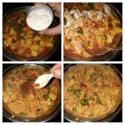 - Finally, add the cream and switch off the flame immediately. Add the garam masala powder now and mix. Garnish with coriander leaves. The mixed vegetable curry is ready to serve.