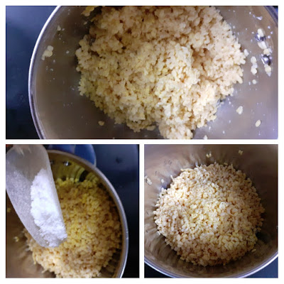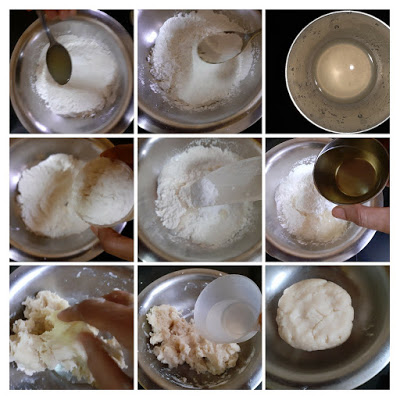 - For the dough–take the Maida, salt, baking powder and ghee in a dish and combine well. When you clump the mixture in your fist, it shouldn’t break. Now add cold water little by little and knead to form a dough. Leave to rest for 15 minutes.