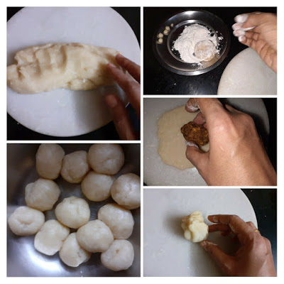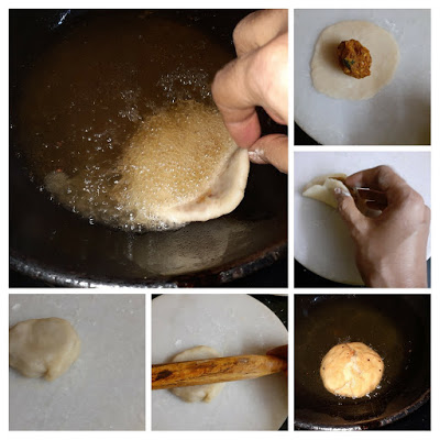 - To form the Kachoris knead the dough again and pinch small portions and make small balls of them. Take one ball at a time and dust with some flour and roll it into a small puri. Put the filling in the center and bring the edges together and seal well. Roll out the puris a little thick with put much pressure or the covering may break in oil spreading the stuffing in the oil. Repeat for all balls likewise and keep aside.