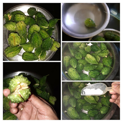 - Assemble all ingredients. Slit the Karela/Bitterourd as shown in the picture, put in salted hot water and keep covered for 5 minutes. Drain the water and cool the bitter gourds.