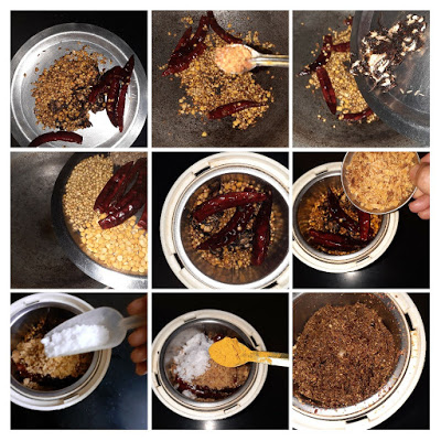 - In a pan add 1 tsp oil and on slow flame roast coriander seeds until you get a nice aroma or until it turns light brown. Now add the Urad dal and chana dal and roast until they turn light brown. Follow up with dry red chillies and roast until crisp. Finally, add the tamarind and fry for 30 seconds. Cool. Grind to almost fine powder, add turmeric powder, salt and jaggery if using) and give it a final spin in the blender.
