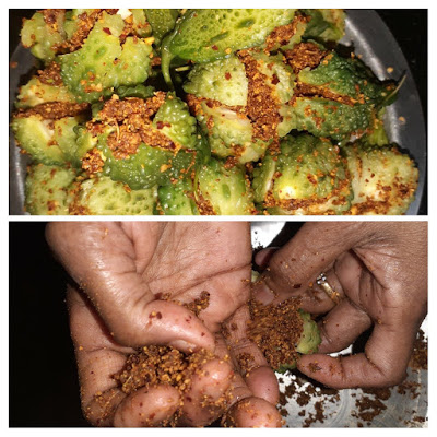 - Fill this stuffing(masala) into the bitter gourds. Reserve some stuffing.