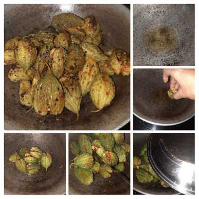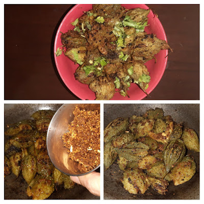 - To make the same recipe with the big ones, cut them in halves and then slit then midway and fill. In this procedure, some stuffing will fall into the oil, but it is fine as long as you keep stirring it every now and then and don’t allow it to burn.