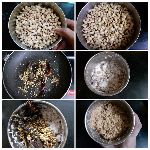 1. Wash and drain the water from Lobia, add fresh water and pressure cook for whistles or until soft.  In a pan, roast the coriander seeds, cumin seeds, dry red chillies, and Kashmiri red chillies until crisp. cool. Now put them in a blender jar along with coconut and grind to a fine paste using little water. Set aside.