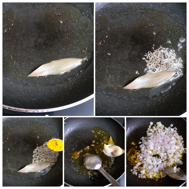2. Now in the same pan take some oil and heat. Add the Bay leaf, followed by cumin seeds, and turmeric powder. When the cumin seeds splutter, add the ginger-garlic paste, and fry. Now drop in the chopped onions and saute.