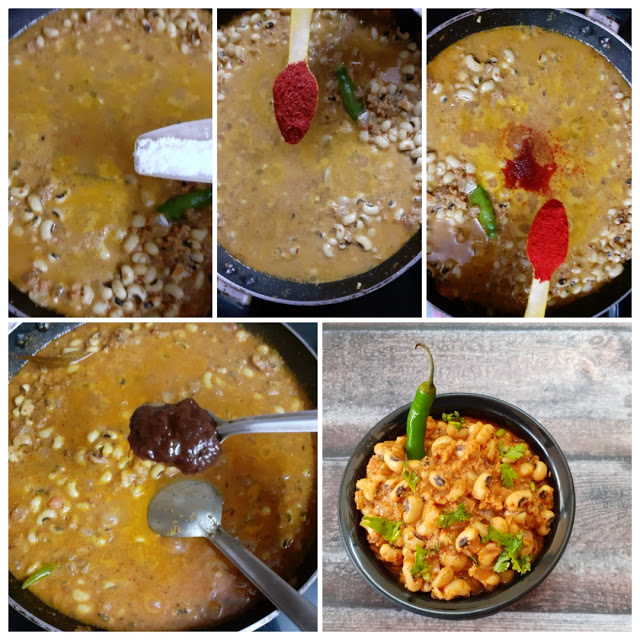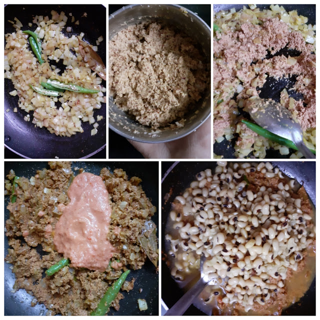 3. When the onions turn light brown, add the split green chillies and saute another 30 secs. Now add the ground masala paste and fry nicely in the oil. When the mixture becomes dry, add the tomato paste, followed by the cooked Lobia/Black eyed beans, along with the water in which the lobia was cooked. Let the mixture simmer for 5 minutes.