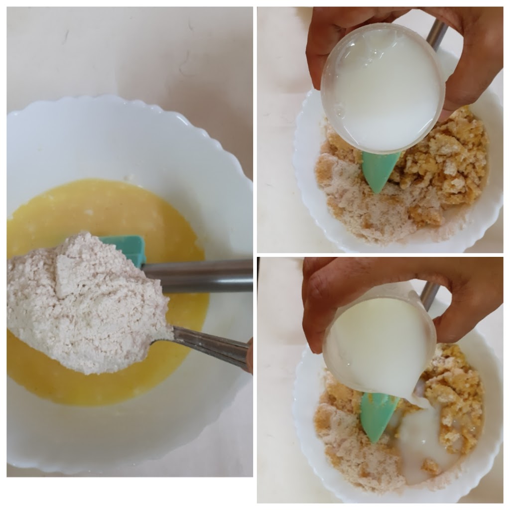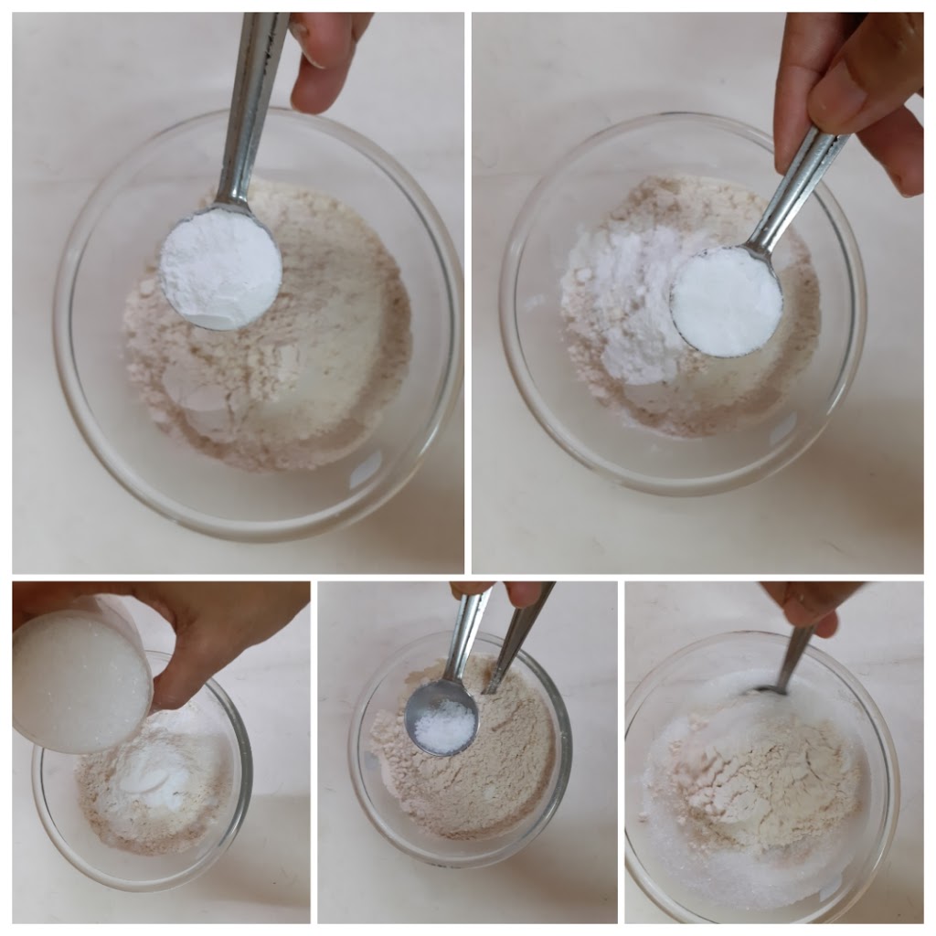 - Firstly put the oven to preheat at 200 C. Now in a bowl mix all the dry ingredients- wheat flour, sugar, baking powder, baking soda and salt.