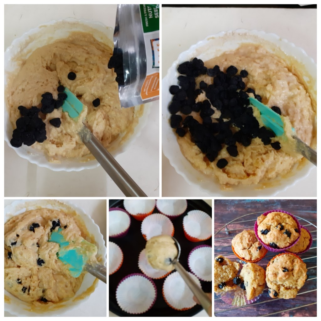 - Finally add the Blueberries and give a gentle stir. Now the batter is ready to fill into the muffin tin/cup cake mould. Bake at 190 C for 15 minutes. Check for doneness by inserting a toothpick in the centre. If a little wet, then bake another 2 minutes. Enjoy the healthy goodness. Serve when warm.