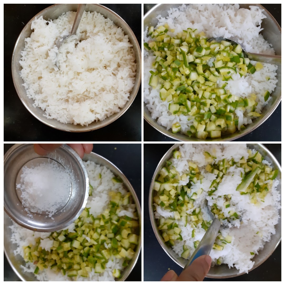 - Cook the rice and cool completely. Curd rice should be soft and not grainy, so add enough water and pressure cook rice. Remove the rice from cooker, mash well and cool the rice completely. Now add the chopped cucumber to the rice, followed by salt and mix well.