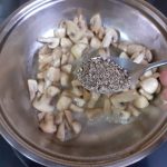 - In a pan melt some butter. To this add the sliced Mushrooms and saute for 30 seconds. Now add salt and continue to saute. The mushrooms will release a lot of moisture, continue to saute. When the water has almost evaporated, add 1 tsp Pepper, and continue to saute until completely dry. Transfer to a plate and set aside.