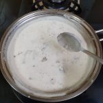 - Gradually add another cup of milk and keep stirring. The broth will start boiling and will start becoming thick. At this stage add another cup of milk, followed by salt and pepper powder. Stir and continue to boil the soup. It will thicken up again, add another cup of milk. Now bring the soup to the desired consistency. If itis too thick, add 1/2cup water to dilute. Finally, add the sauteed mushroom and stir nicely. Serve hot with some bread.