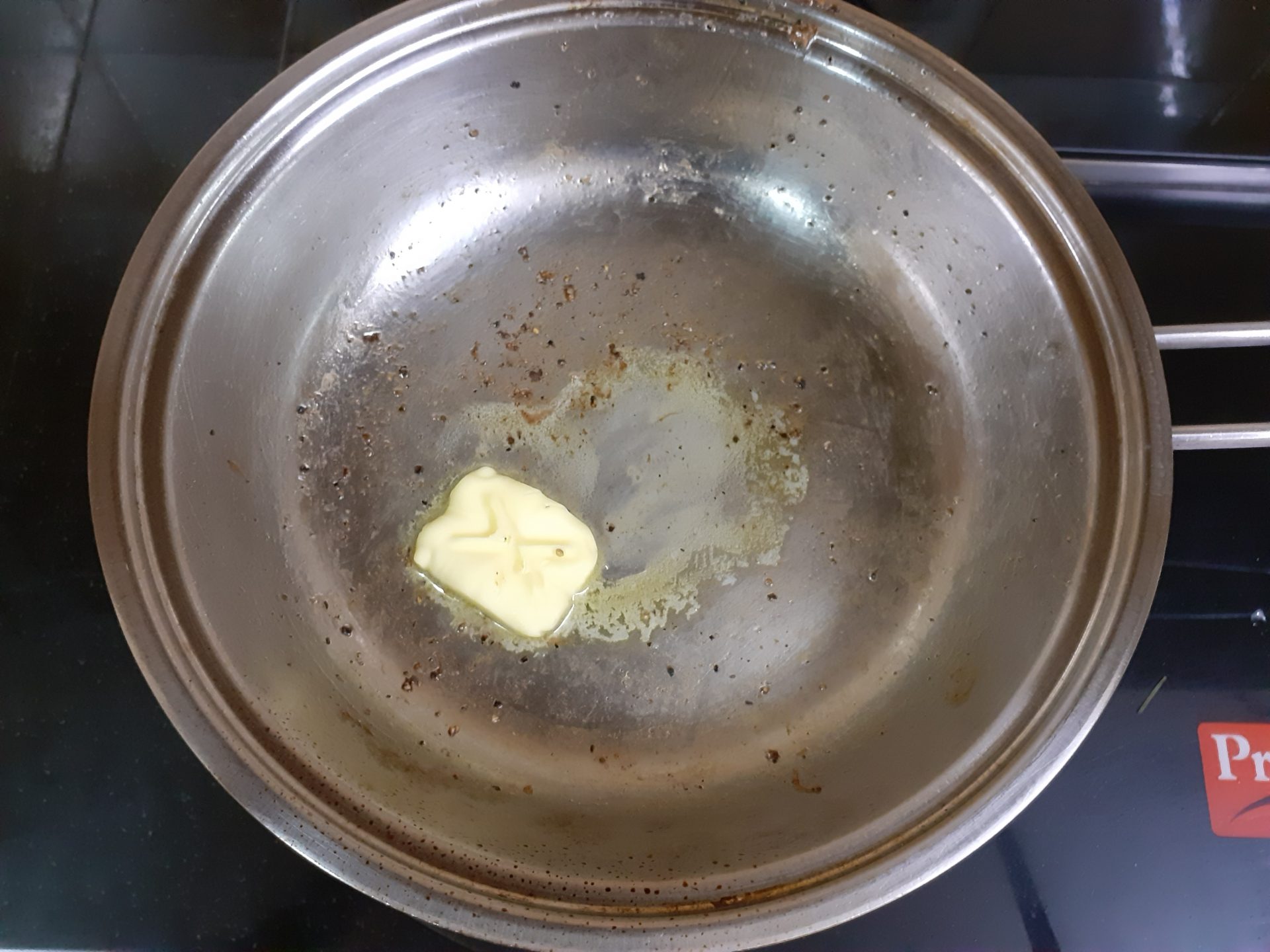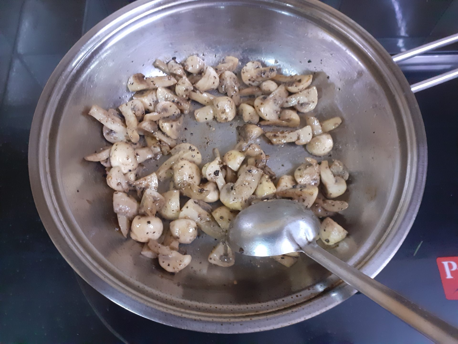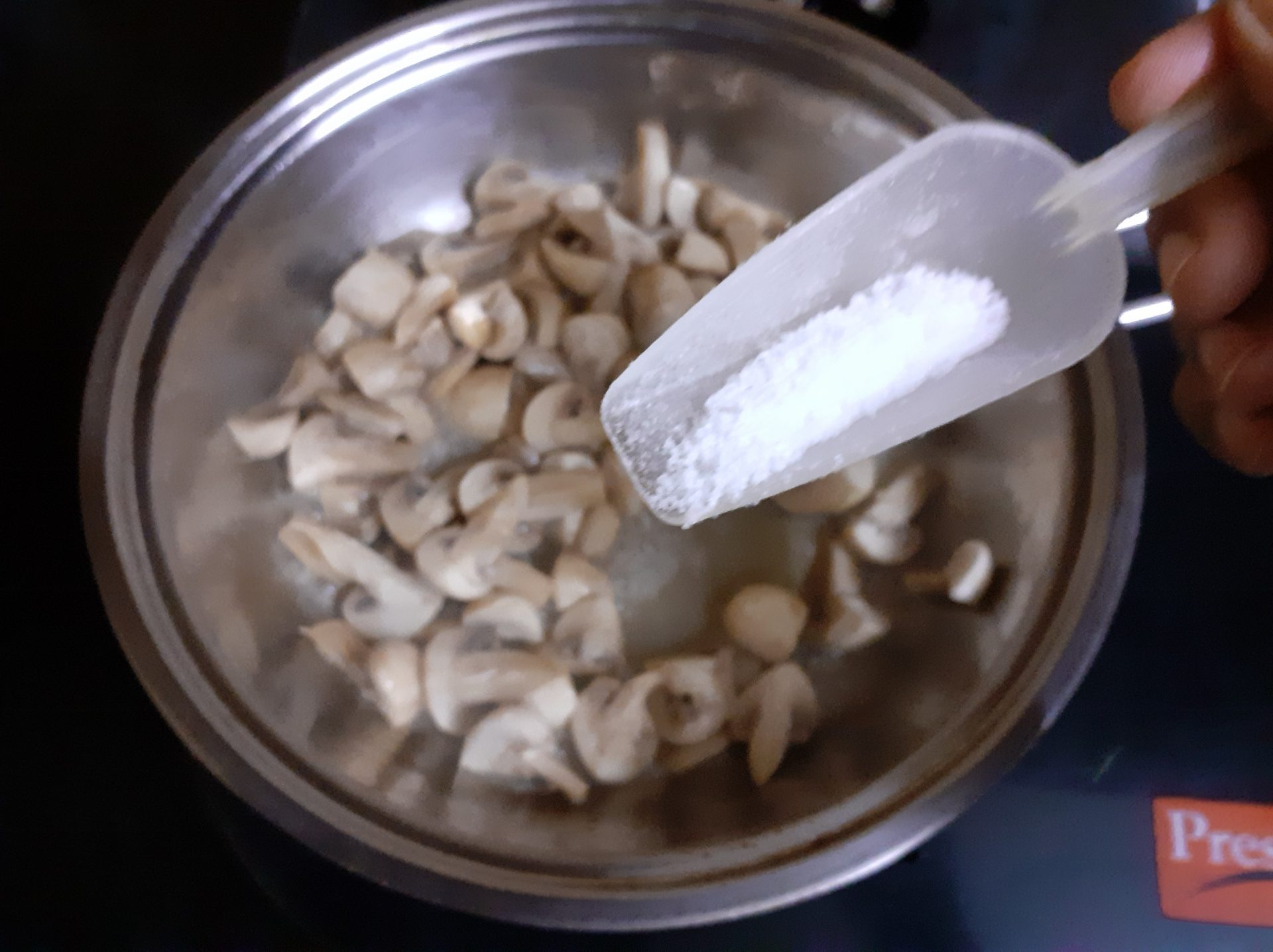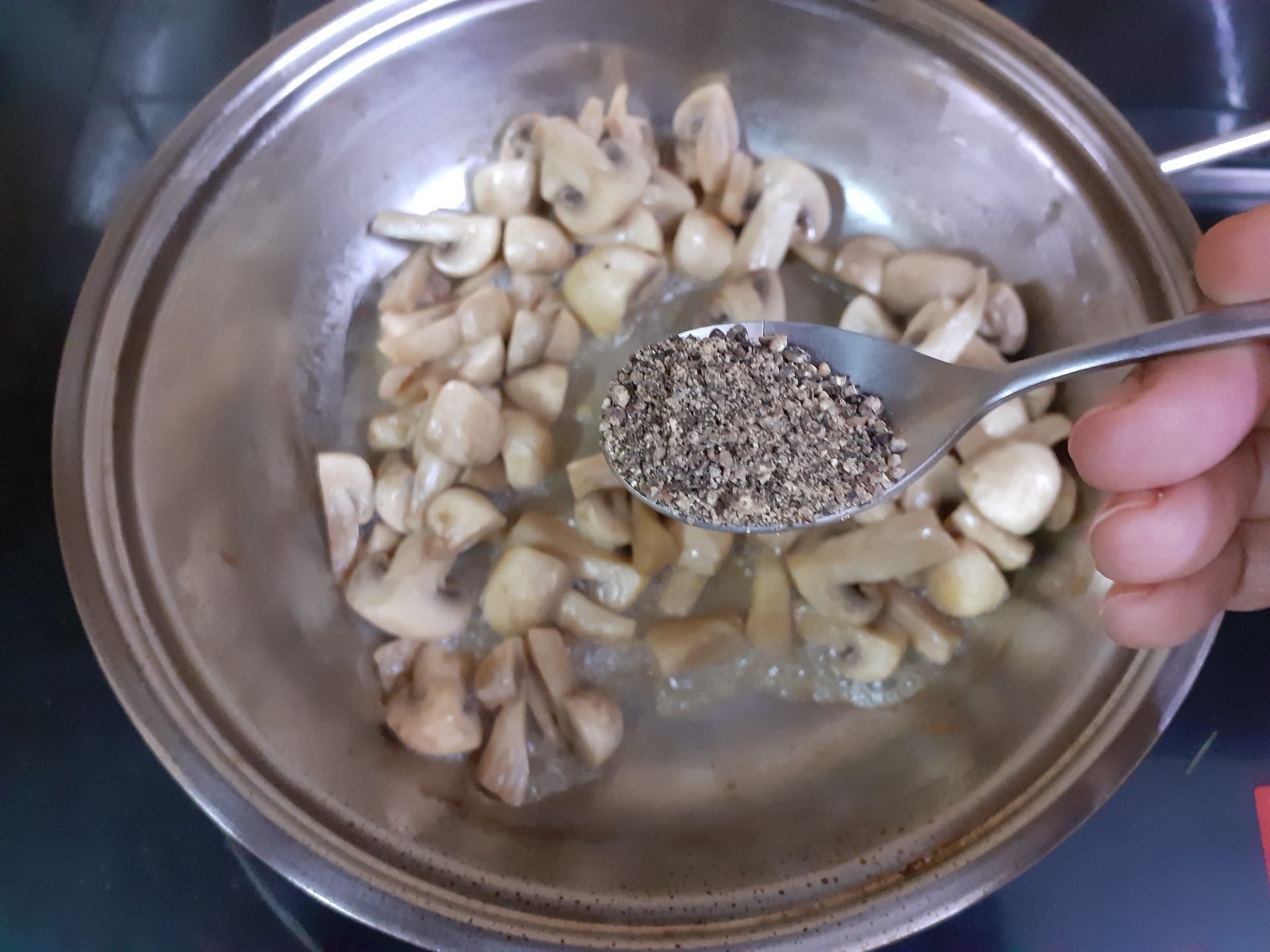 - In a pan melt some butter. To this add the sliced Mushrooms and saute for 30 seconds. Now add salt and continue to saute. The mushrooms will release a lot of moisture, continue to saute. When the water has almost evaporated, add 1 tsp Pepper, and continue to saute until completely dry. Transfer to a plate and set aside.