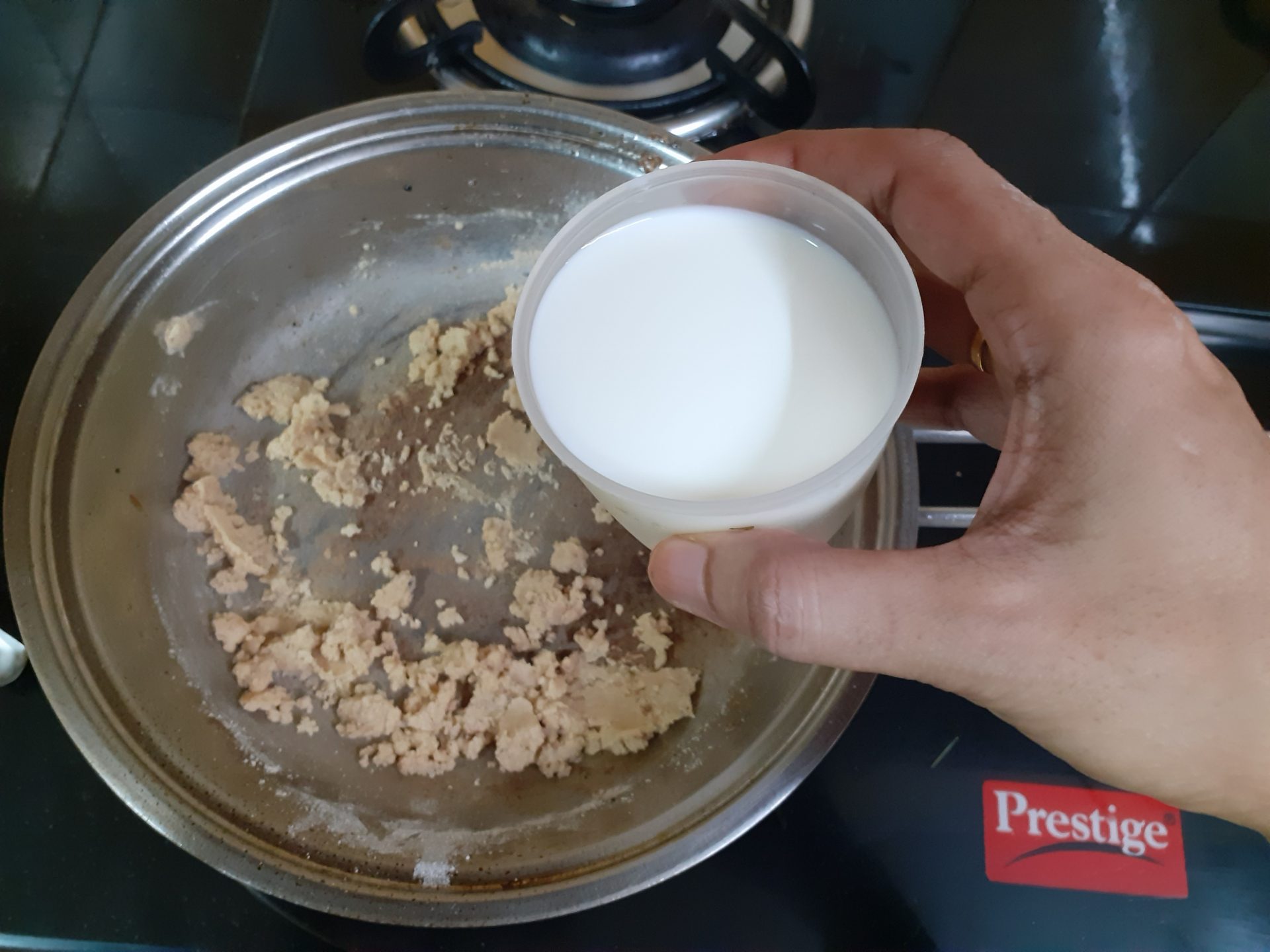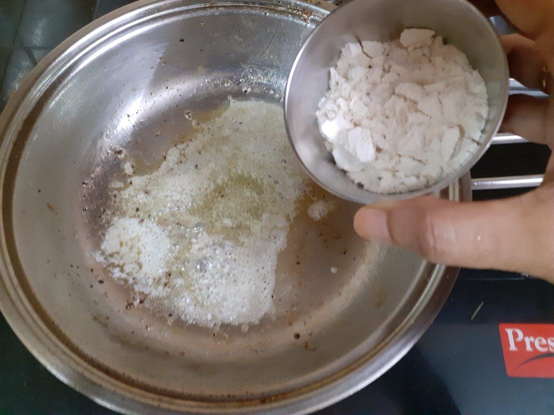- Now to the same pan add 2 tbsp butter. When it melts add the flour gradually and keep stirring simultaneously. The flour should get nicely toasted in the butter, but should not burn. The flour may turn lumpy,but don’t worry.Add some more butter if required and toast the flour well. Now turn off the flame,and gradually add one cup milk. Stir nicely and dissolve the flour nicely making it a lump free mixture and turn on the flame now.