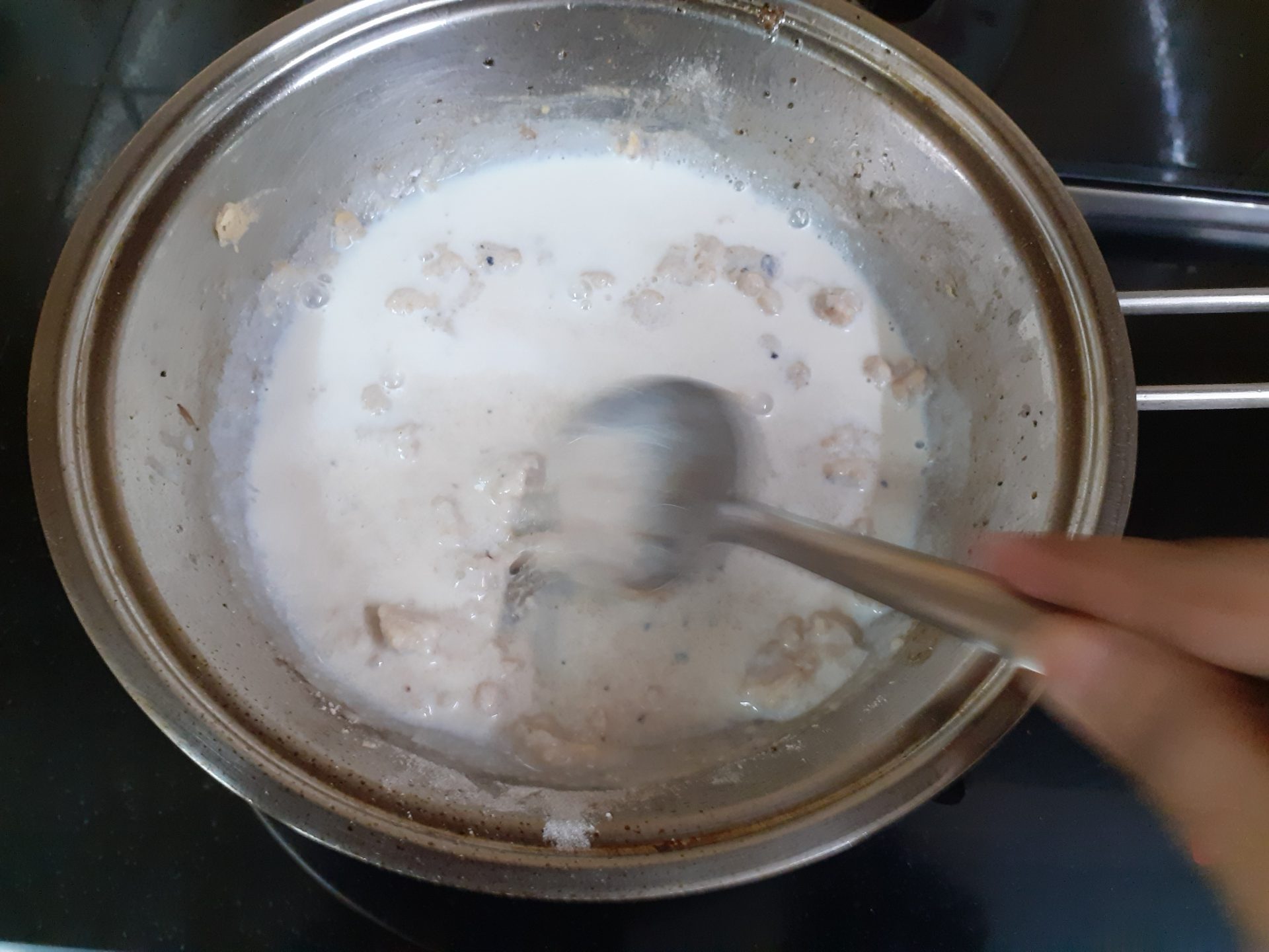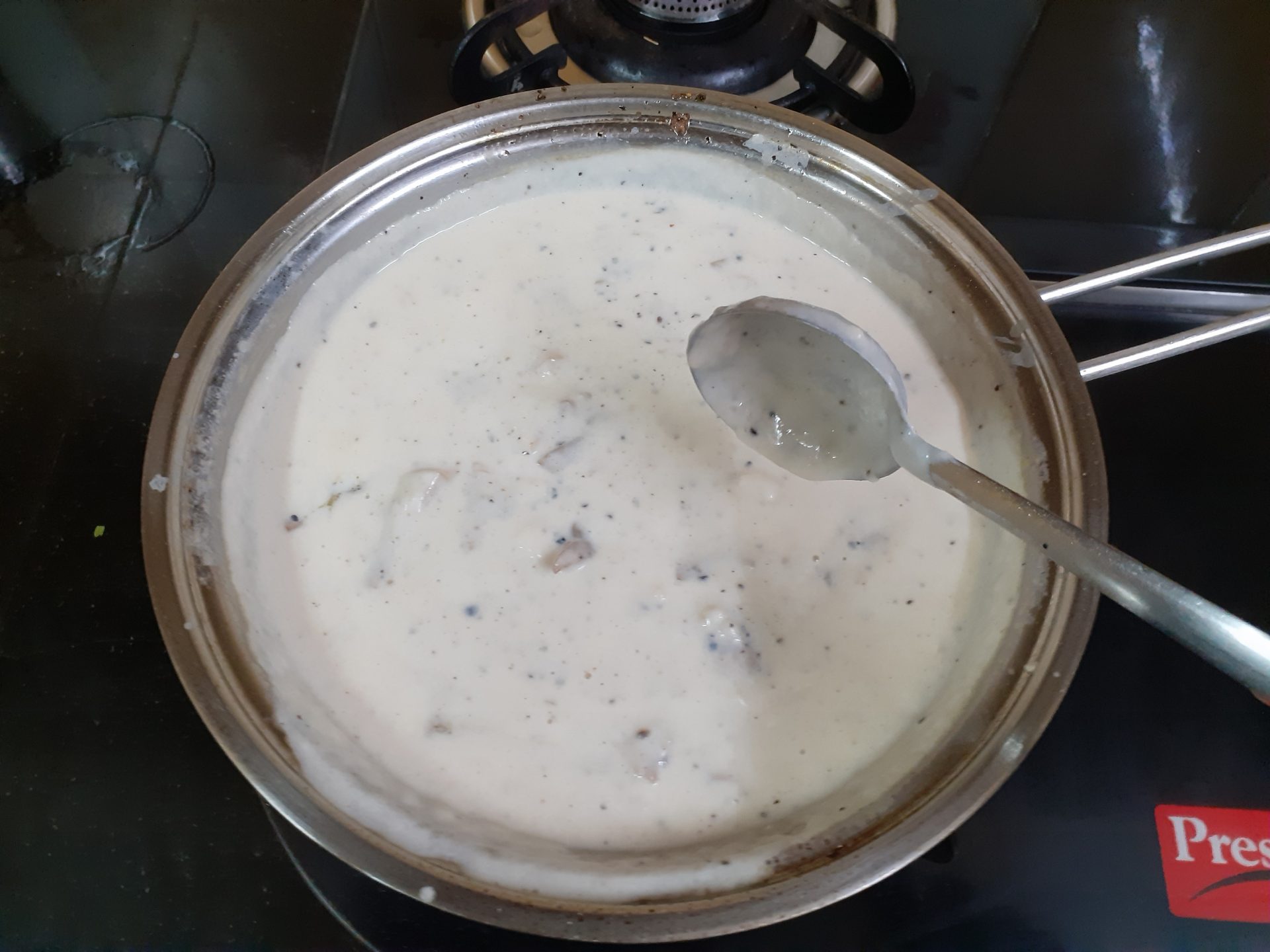 - Gradually add another cup of milk and keep stirring. The broth will start boiling and will start becoming thick. At this stage add another cup of milk, followed by salt and pepper powder. Stir and continue to boil the soup. It will thicken up again, add another cup of milk. Now bring the soup to the desired consistency. If itis too thick, add 1/2cup water to dilute. Finally, add the sauteed mushroom and stir nicely. Serve hot with some bread.