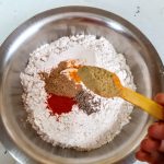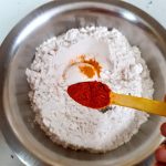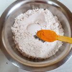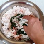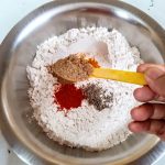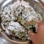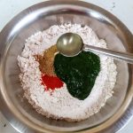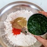 - Chop and blanch the Palak/spinach in hot water for 10 minutes. drain the hot water( don’t discard. it can be used as stock for soups). Cool the spinach and blend it into a fine puree. Set aside. Now take the wheat flour in a big mixing bowl and add salt,cumin seeds, turmeric powder, red chilli powder, coriander powder, fennel powder and mix well.