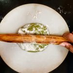- After 10 minutes divide the dough into 10 equal portions and round them up. Take one ball at a time,dust with flour and roll out a little thicker than Roti/Chapatis. Repeat for all.