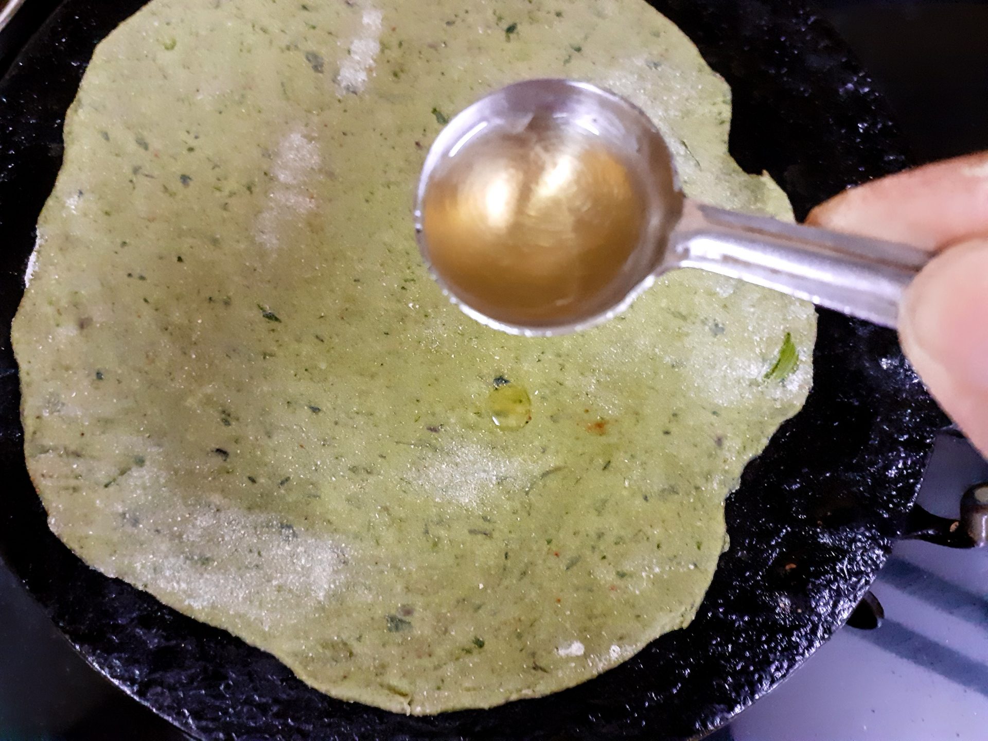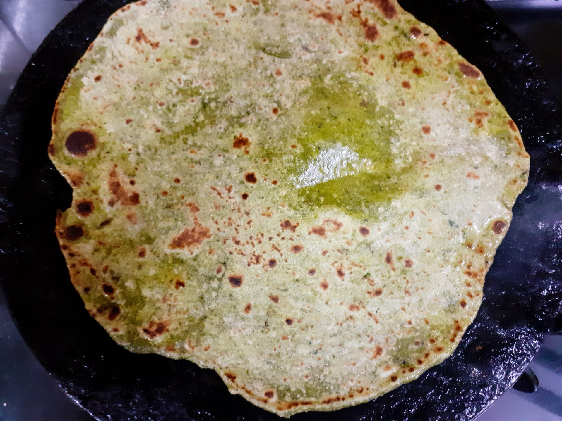 - Now heat a Tava/girdle and put the rolled out dough on it.Drizzling a little oil cook on one side, now flip and cook on the other side. cook until small black dots appear. Repeat for all the dough. Serve them hot.
