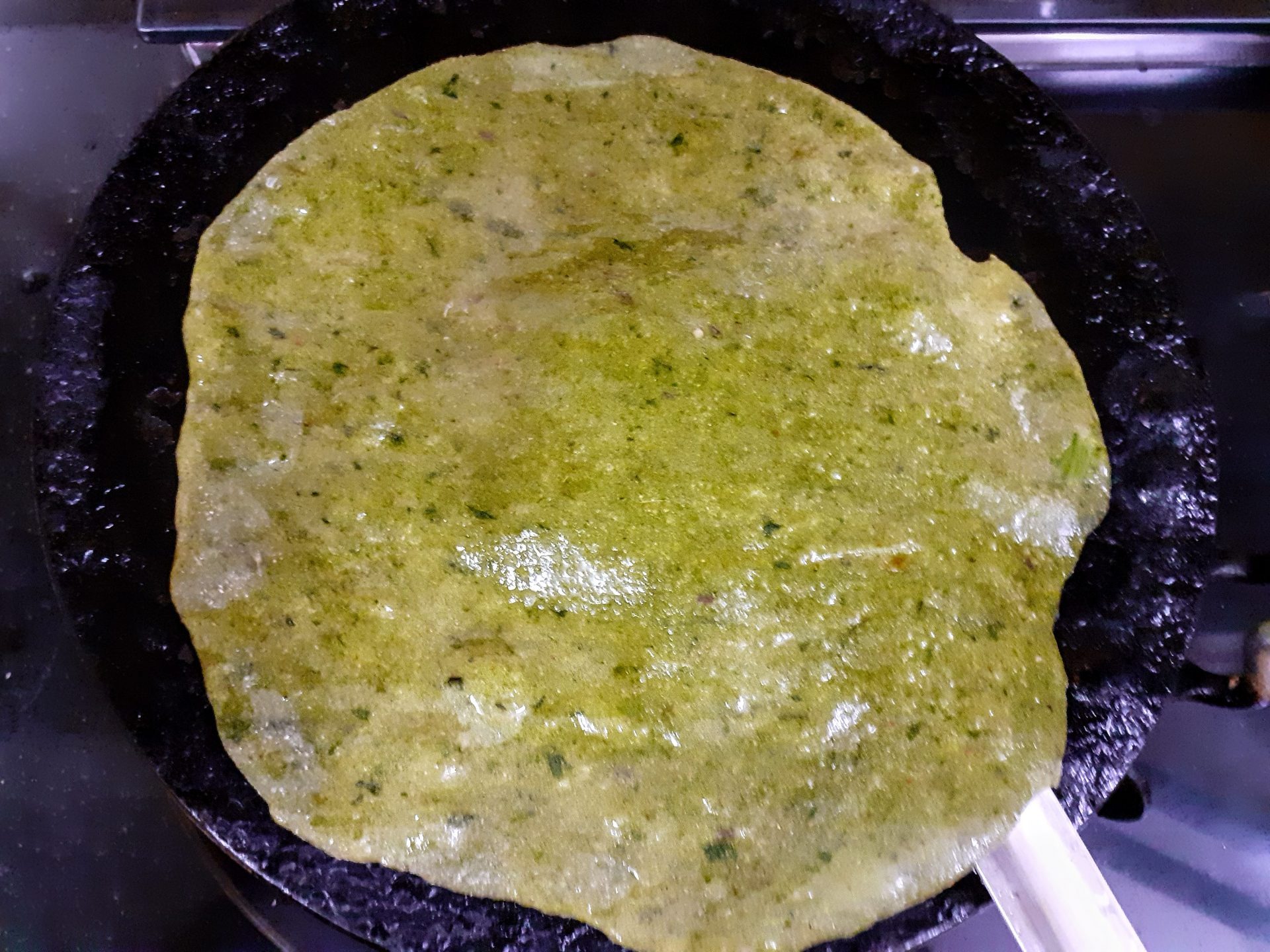 Chop and blanch the Palak/spinach in hot water for 10 minutes. drain the hot water( don’t discard. it can be used as stock for soups). Cool the spinach and blend it into a fine puree. Set aside. Now take the wheat flour in a big mixing bowl and add salt,cumin seeds, turmeric powder, red chilli powder, coriander powder, fennel powder and mix well. Now add a little oil,and mixing the Palak Puree, a little at a time start mixing the dough. If the puree is over and the dough is still dry and needs more moisture, add water a little at a time and knead it forming a soft, yet firm dough. Apply little oil and rest the dough for 10 minutes atleast. After 10 minutes divide the dough into 10 equal portions and round them up. Take one ball at a time,dust with flour and roll out a little thicker than Roti/Chapatis. Repeat for all. Now heat a Tava/girdle and put the rolled out dough on it.Drizzling a little oil cook on one side, now flip and cook on the other side. cook until small black dots appear. Repeat for all the dough. Serve them hot.