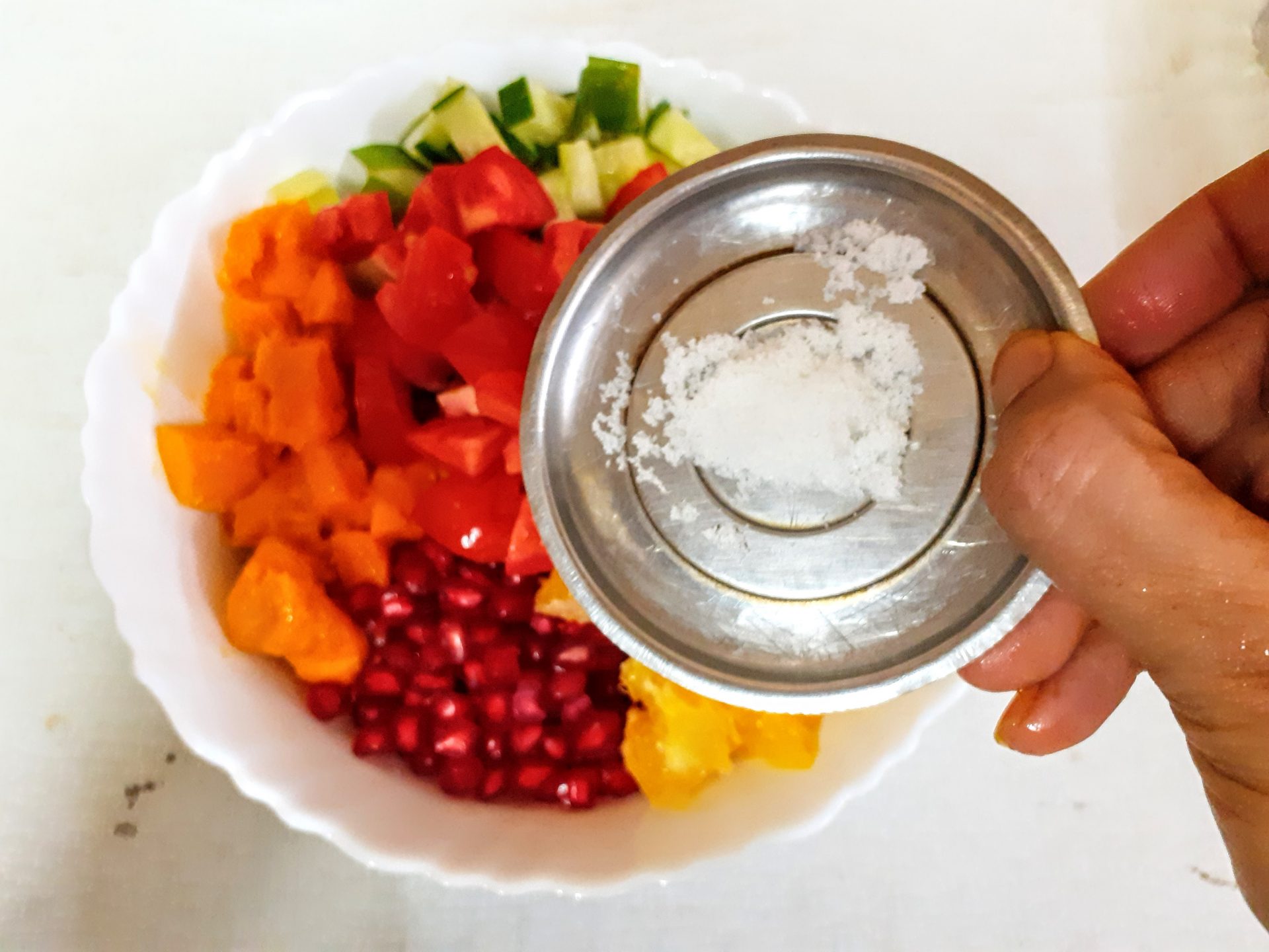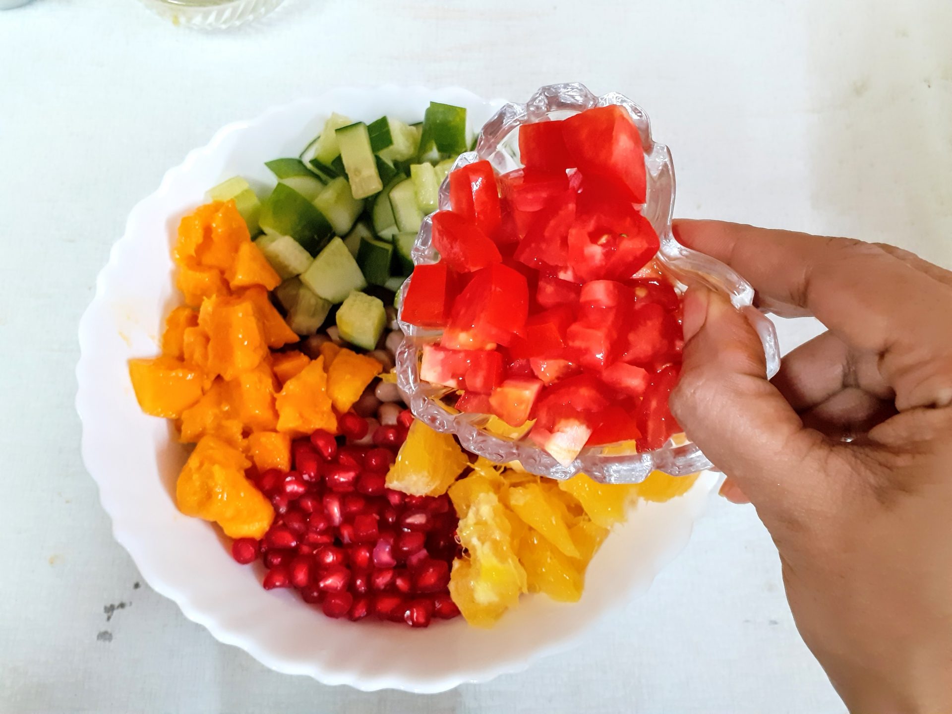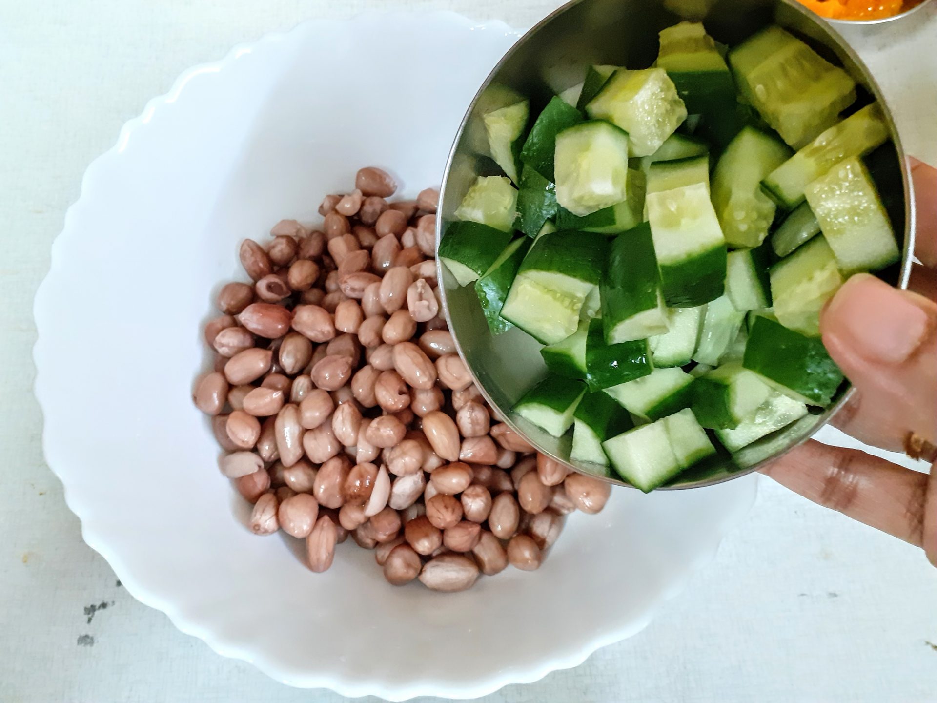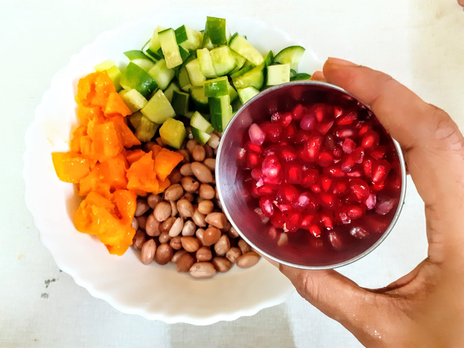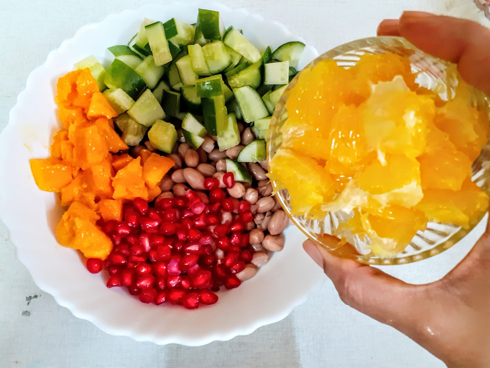 - Soak raw Peanuts for 2 hours atleast, and pressure cook them for 4 whistles. Let pressure settle,drain water and cool the peanuts. Take the peanuts in a bowl and add, diced cucumbers followed by mango( Black Plum aka Java plum for diabetics), pomegranate, peeled orange segments, and tomatoes.