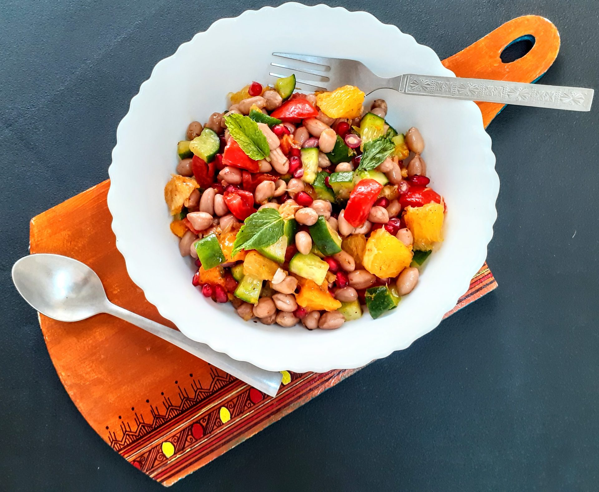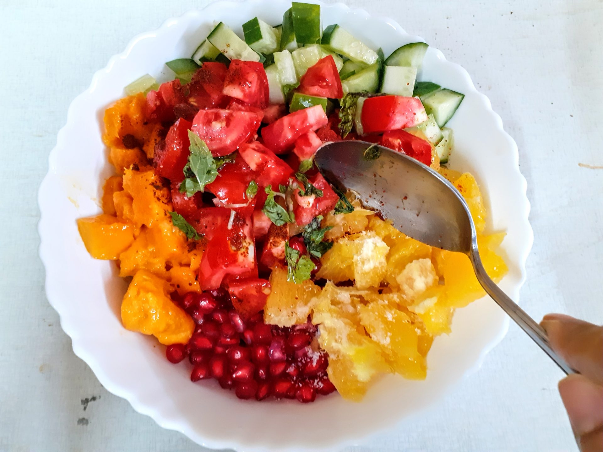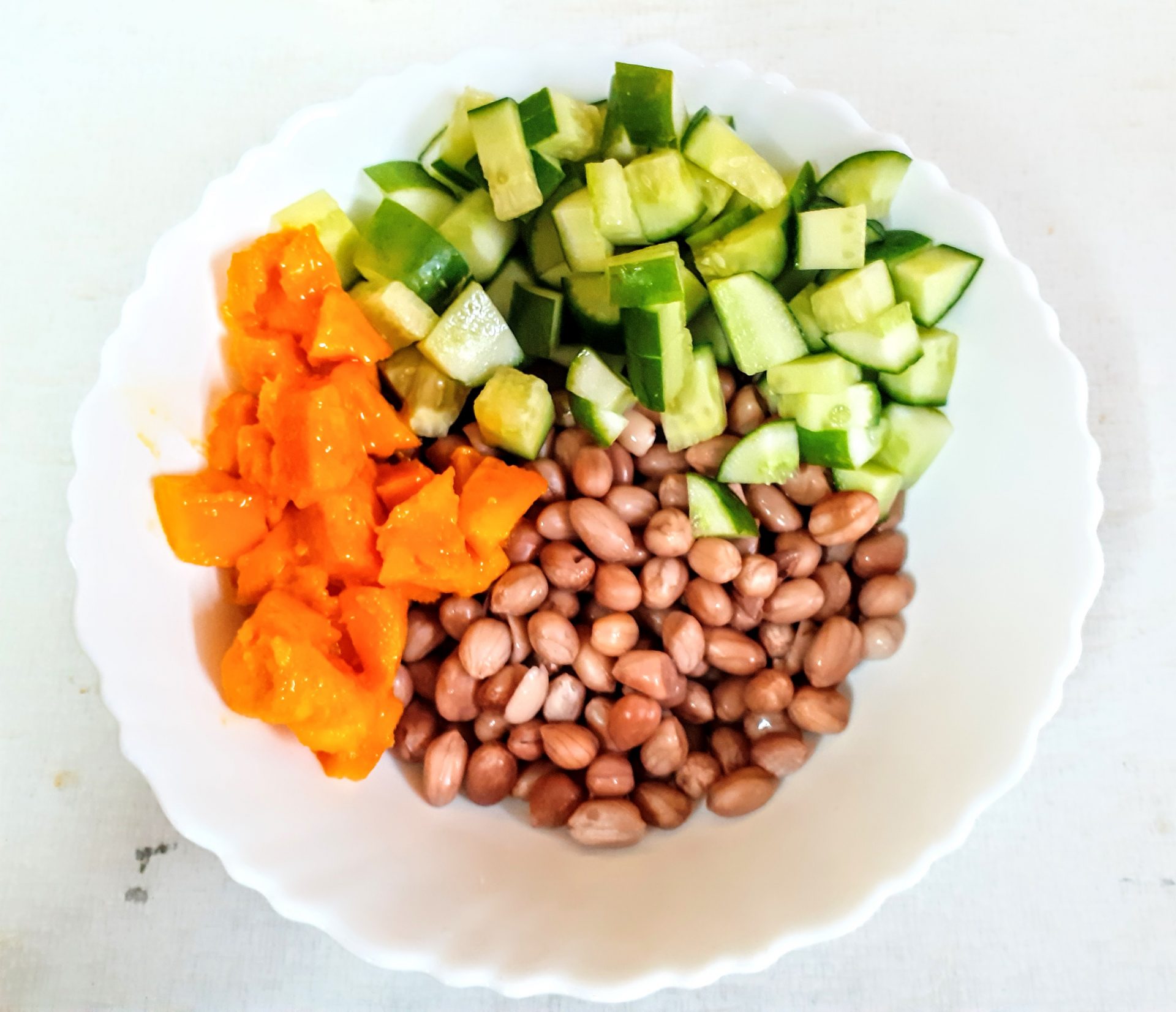 Soak raw Peanuts for 2 hours atleast, and pressure cook them for 4 whistles.Let pressure settle,drain water and cool the peanuts. Take the peanuts in a bowl and add, diced cucumbers followed by mango( Black Plum aka Java plum for diabetics), pomegranate, peeled orange segments, and tomatoes. Now add Salt, red chilli/paprika powder, Tandoori masala powder, lemon juice, Mint leaves, olive oil, and give it all a good mix. The healthy and delicious salad is ready.