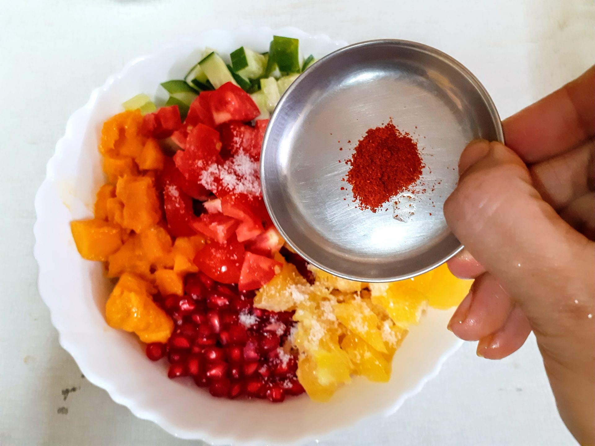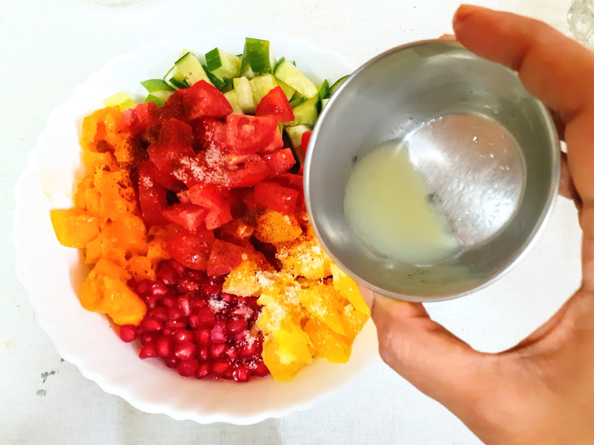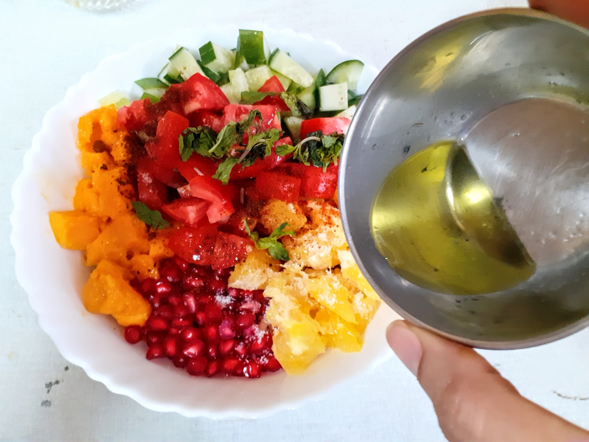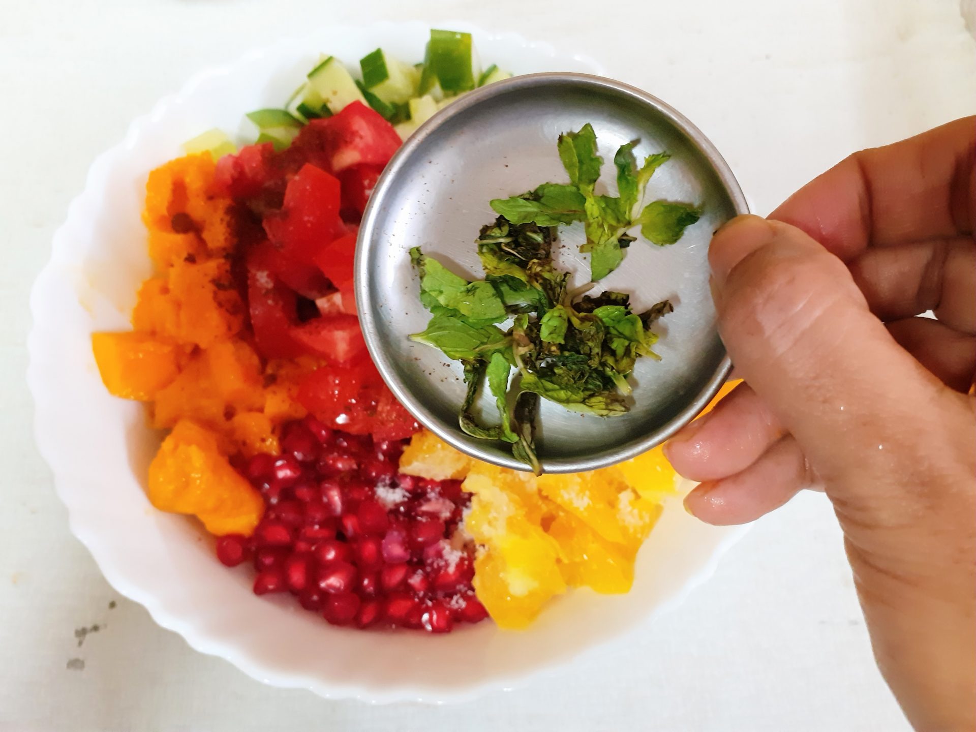 - Now add Salt, red chilli/paprika powder, Tandoori masala powder, Lemon juice, Mint leaves, olive oil, and give it all a good mix. The healthy and delicious salad is ready.