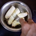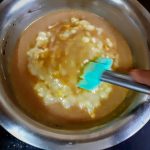- Now mash the overripe Bananas in a bowl and add them to the creamed mixture. Add vanilla essence, and sift the flour directly into the creamed mixture and fold well.