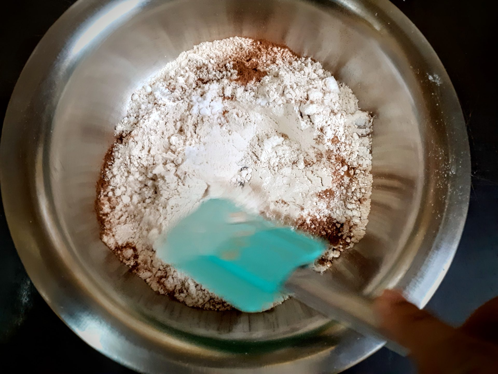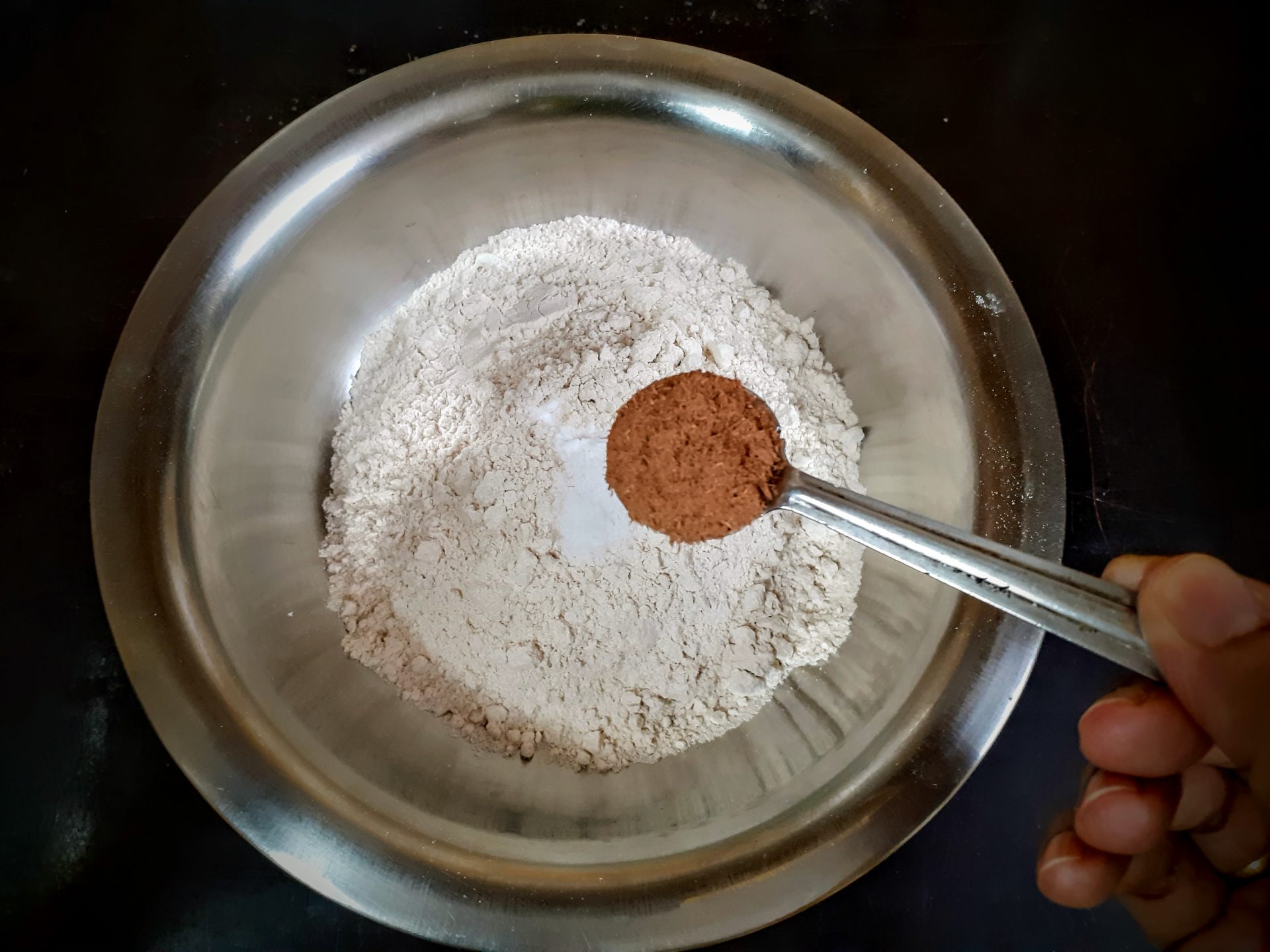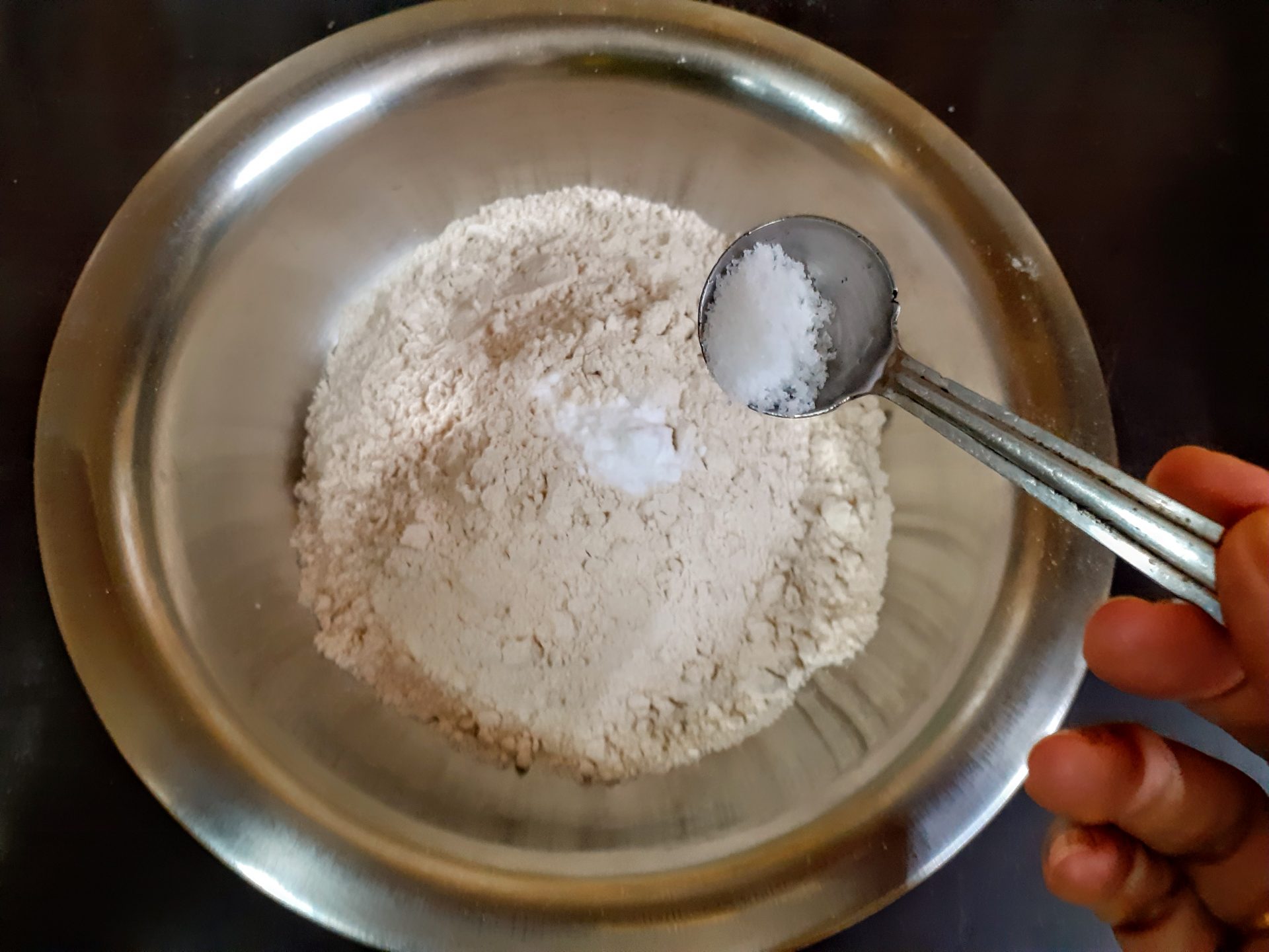 - In a bowl take the whole wheat flour. Add Baking soda,salt, cinnamon powder, and mix well. Transfer to another bowl. Keep aside.